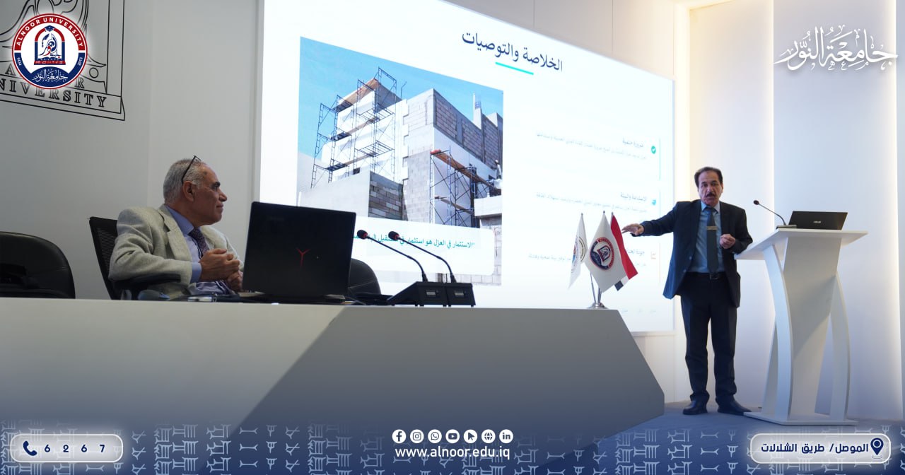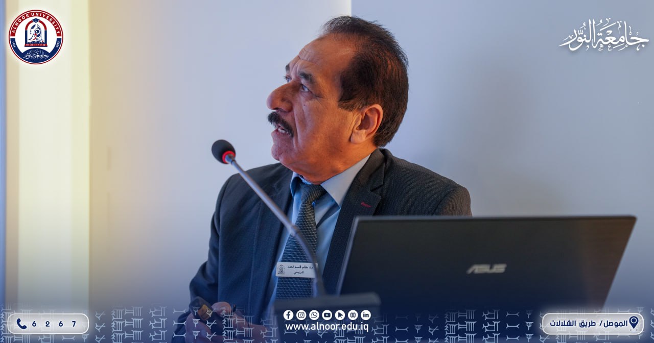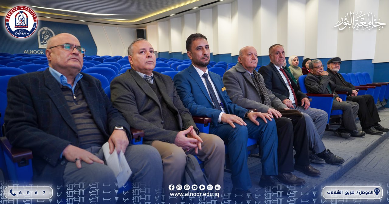 بحضور الاستاذ الدكتور سعد الطعان عميد كلية الهندسة في جامعة النور والدكتور نزار عبد اللطيف عميد كلية الفنون التطبيقية في الجامعة نظّم قسم التصميم الداخلي، يوم الأربعاء الموافق 2026/2/4، محاضرة علمية متخصصة حول تقنيات العزل، بإشراف الدكتور عبد السلام مال الله، قدّمها الدكتور حاتم قاسم أحمد الجميلي.